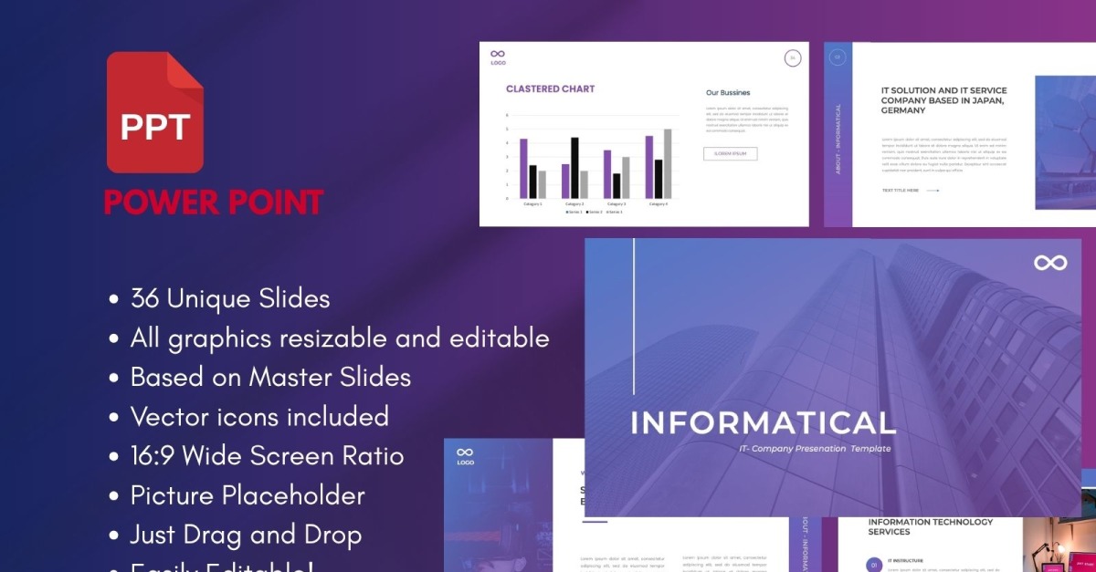Introducing INFORMATICAL – **IT Company PowerPoint Presentation Template** This Presentation Template can be used for any variety of purposes, such as: agency, company, corporate, business, portfolio, photography, projects, startup, pitch deck and also can be used for Personal Portfolio. **FEATURES** – Total Slides: 36 Slides – All graphics resizable and …