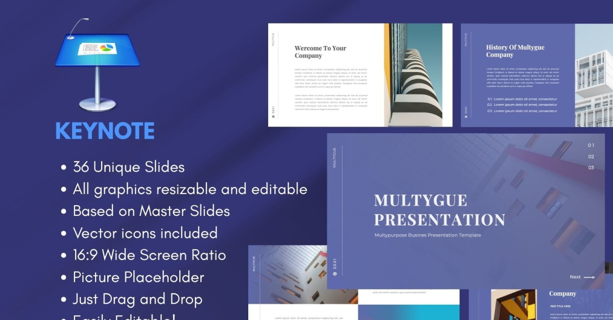 Introducing MULTYGUE – **Business Multipurpose Keynote Template** This Presentation Template can be used for any variety of purposes, such as: agency, company, corporate, business, portfolio, photography, projects, startup, pitch deck and also can be used for Personal Portfolio. **FEATURES** – Total Slides: 36 Slides – All graphics resizable and editable …