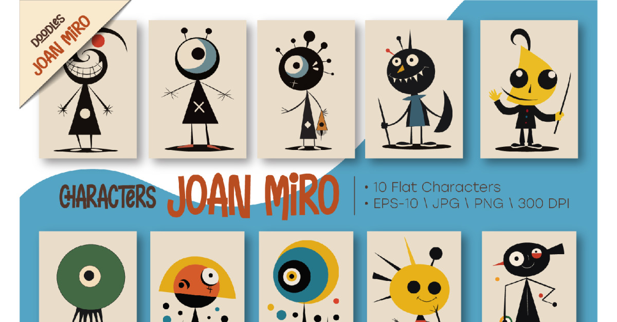 Characters in the style of Joan Miro 01. A set of whimsical characters in the style of Joan Miro. Minimalistic flat characters made of geometric shapes. Only 10 pieces. Ideal for making cards, scrapbooking and invitations, stationery, posters, wall hangings, surface patterns, packaging papers, social media, cases, quotes, blogs, web, …