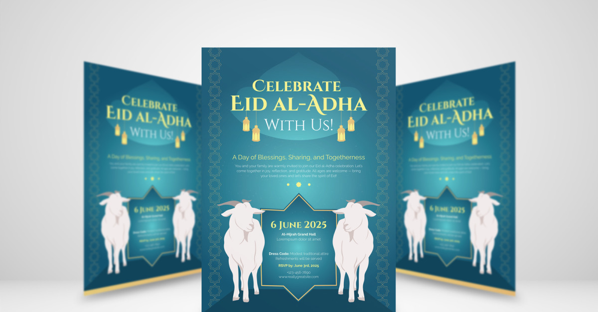 Modern Blue-Gold Eid al-Adha Invitation Celebrate Eid al-Adha in style with this modern invitation template, featuring a rich blue-to-green gradient background and elegant gold accents. Designed to evoke a festive yet spiritual ambiance, this layout includes: Illustrated sacrificial goatsHanging Islamic lanternsTraditional geometric patternsGold calligraphy-style typographySpace for custom text: event name, …