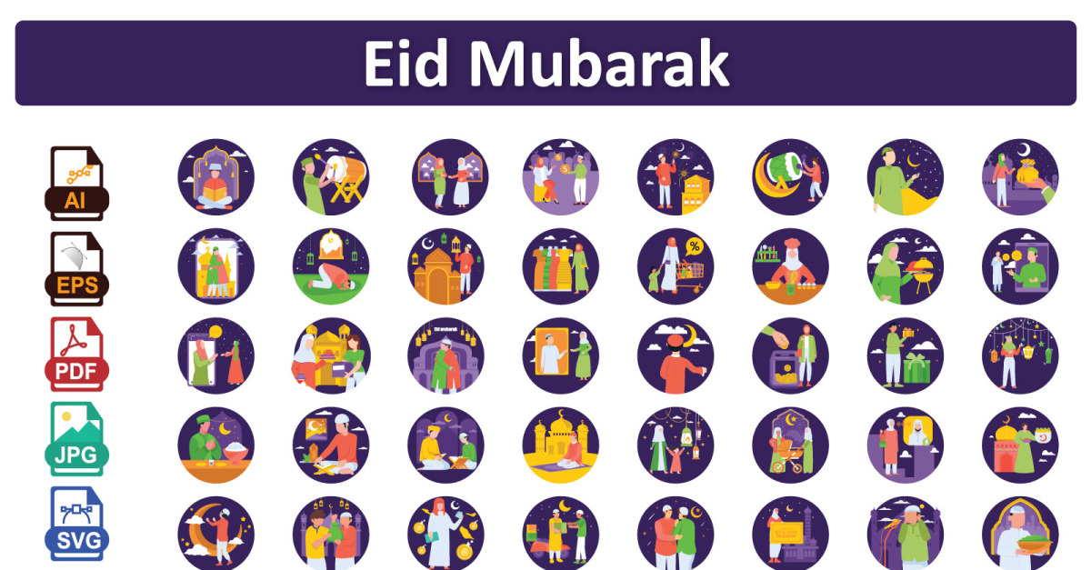 Celebrate the joyous occasion of Eid with this vibrant Eid Mubarak Illustration Pack, designed to bring warmth and festive cheer to your creative projects. This collection features beautifully detailed vector illustrations that capture the spirit of Eid, including crescent moons, stars, traditional lanterns, prayer mats, and family gatherings. Use for …