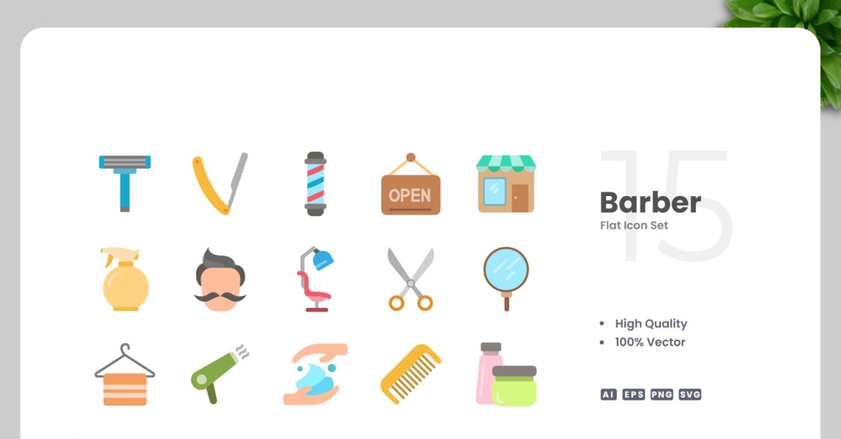 Set of 15 Barber flat icons | Simple and clean design, perfect for websites, mobile apps, books, social media, infographics, flyer, print, banners, posters and many more. To resize or change color you can easily edit on vector software like Adobe Illustrator and CorelDRAW. Features : High Quality Design100% Vector100% CustomizableEasy …