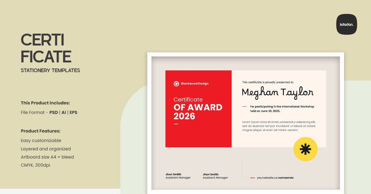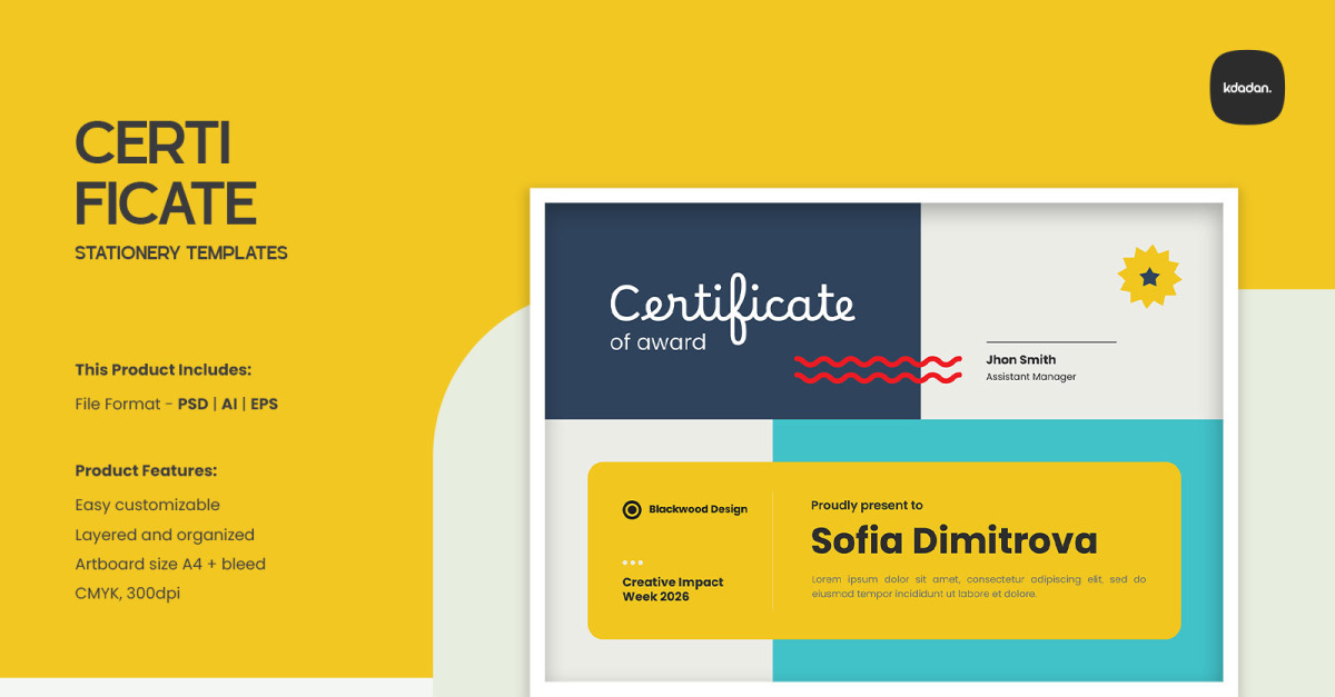 Overview : Clean, Modern and Professional Certificate. Fully customizable, easy to use and replace colors & text, logo containers are Smart-Objects to make it easy for you to add logo and edit files. This Product Includes: – Compatible files for Adobe Photoshop CS/CC – Compatible files for Adobe Illustrator CS/CC …